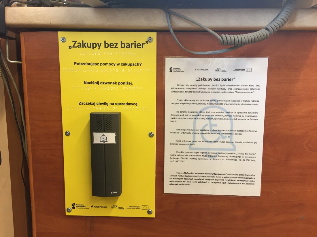 Projekt Zakupy bez barier realizowany był przez Gminny Ośrodek Pomocy Społecznej w Kętach od 01.09.2017 do 30.04.2018. Projekt zakładał wdrożenie innowacji polegającej na umieszczeniu w sklepach dzwonka, który ułatwi osobom z różnymi rodzajami niepełnosprawności samodzielnie zrobić zakupy. Dzwonek został zaprojektowany zgodnie z ich wytycznymi, a osoby z niepełnosprawnością samodzielnie przeszkoliły personel sklepu. Na dyskretny dźwięk dzwonka sprzedawca wychodzi naprzeciw klienta, dopytuje o jego potrzeby i oczekiwania, a następnie wspiera w realizacji zakupów – wskazuje, gdy znajduje się produkt, sprawdza jego skład, gramaturę, datę ważności, pomaga po niego sięgnąć, trzymać koszyk, doradza.