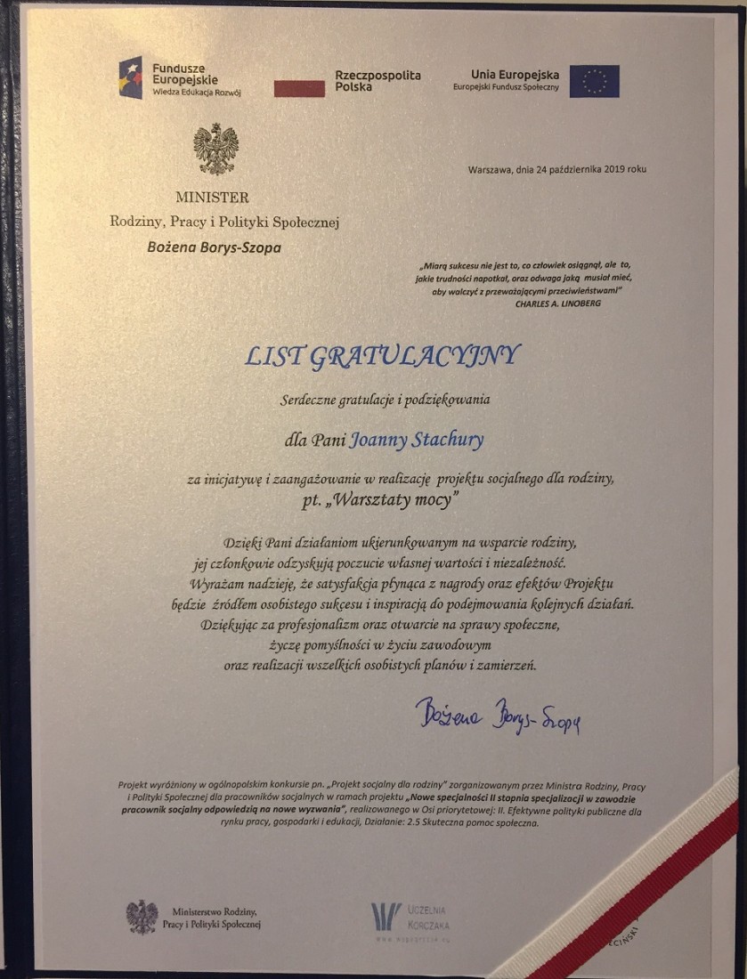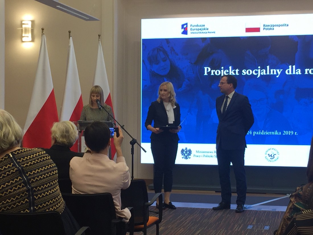 Wczoraj, 24 października 2019 r. odbyło się uroczyste wręczenie nagród i wyróżnień w konkursie „Projekt socjalny dla rodziny” zorganizowanym przez Ministerstwo Rodziny, Pracy i Polityki Społecznej oraz Wyższą Szkołę Pedagogiczną im. Janusza Korczaka w Warszawie i Uniwersytet Szczeciński.