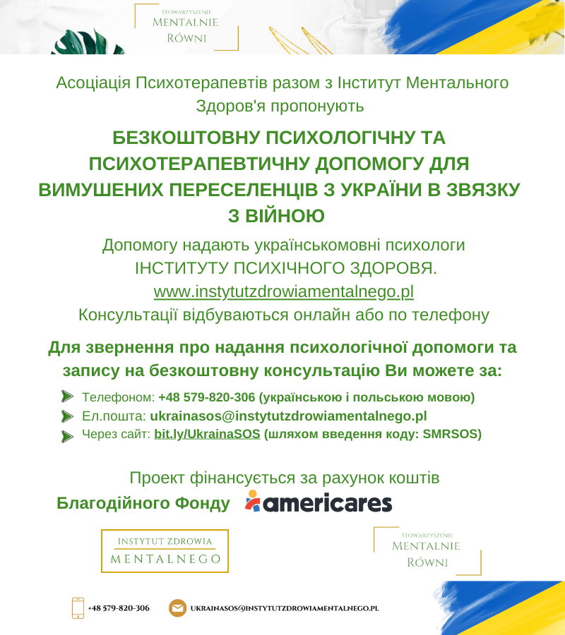 Stowarzyszenie Mentalnie Równi wraz z Instytutem Zdrowia Mentalnego zapewniają darmową opiekę psychoterapeutyczną dla uchodźców z porgrążonej w wojnie Ukrainy. Pomoc świadczą ukraińskojęzyczni psychologowie Instytutu Zdrowia Mentalnego - www.instytutzdrowiamentalnego.pl